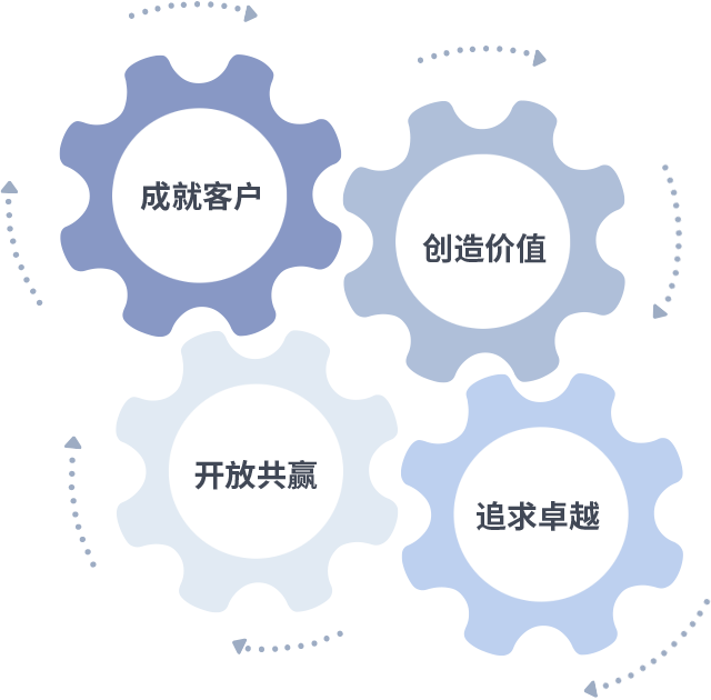 成就客户是一切决策的出发点,,,,创造价值是衡量所有工作的标准,,追求卓越是我们做事做人的态度,,开放共赢是我们的格局也是最终的结果。。。。价值观的齿轮环环相扣,,推动着组织里的每个人不断向前。。。